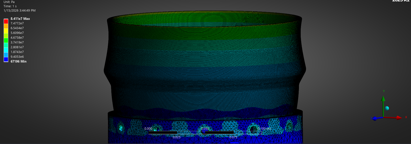 Analysis of the composite retention ring using Aluminum 6061-T6 showed a sufficient factor of safety proven through FEA and hand calculations, with a 500psi chamber pressure and 2250lbf thrust acting on the piece equating to roughly 7700lb acting axially across the area of the ring. The hoop stress felt by the ring is also partly carried by the carbon fiber overwrap; however, this part is not shown in the FEA.